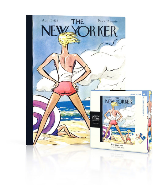 Step back into the golden age of summer with Bay Watchers, a 100-piece mini puzzle featuring charming artwork from a Summer 1929 issue of The New Yorker. In this warm summer scene, two identical figures—one large and one small, perhaps father and son—stand with their backs to the viewer, posed as vigilant lifeguards on a sun-soaked beach. Their matching silhouettes exude a sense of quiet strength as they watch over beachgoers, evoking the nostalgia of long, carefree summer days spent by the sea. Perfect for puzzle lovers and fans of vintage art, this compact puzzle captures a timeless and humorous moment from beach life, blending the playful with the serene. Piece together this nostalgic snapshot of seaside summers, one sun-kissed puzzle piece at a time.