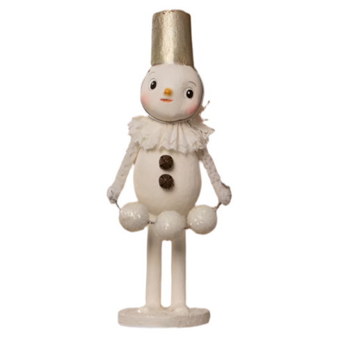 Introducing our Bucket Head Snowman, a whimsical Christmas design by Michelle Lauritsen. This jolly snowman brings festive cheer with his vintage-style silver bucket as a hat, adding a playful and nostalgic touch to his frosty charm. In his hands, he holds a garland of snowballs, ready to deck the halls with holiday spirit. Standing at 2" x 1.5" x 5", this delightful piece is crafted from hand-painted resin, glitter, crepe paper, chenille, plastic beads and a bell. Perfect for adding a fun and sparkly touch to your seasonal decor, this snowman will bring a smile to everyone who sees him!