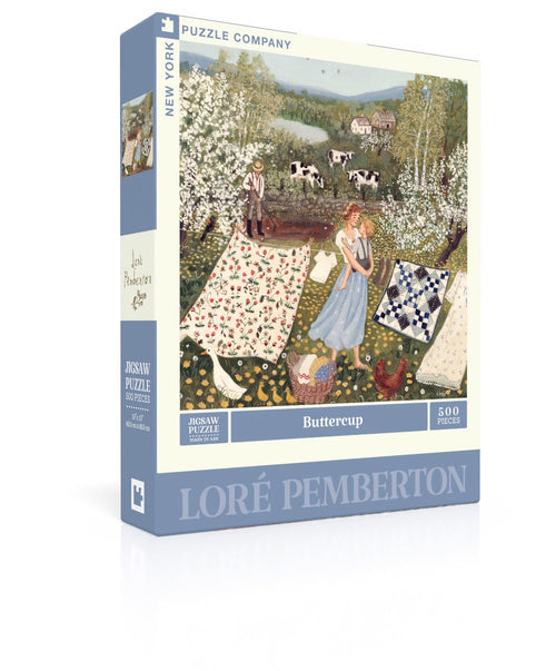 Buttercups cover the ground as a mother takes a break from hanging laundry to share a tender moment with her young child. A farmer plots land for planting and cows leisurely eat away at the grass.