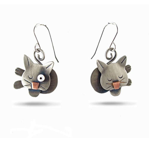 Antiqued nickel silver cats with one asleep and one peeking. Fabricated and finished with Sterling ear wires. 0.75 x 0.75"each.