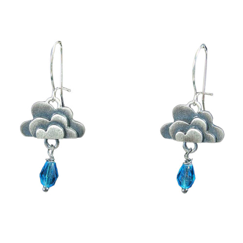 Cast sterling silver cloud charms with a blue czech glass raindrop dangle. Completed with locking sterling silver kidney wires 1 x 0.5" each.