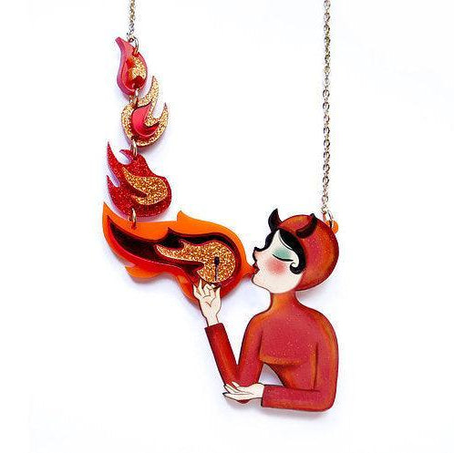 Wear a wicked little piece of art around your neck. This Fire Breather necklace features an original illustration by LaliBlue, hand-crafted in Spain from glossy-finished illustrated wood and methacrylate. The pendant measures 5 x 7 cm and hangs from an approximately 25 cm chain—perfectly sized for layering or solo statement wear. A playful conversation starter for Halloween devotees and illustration lovers alike.