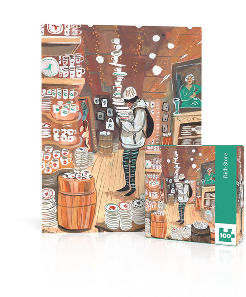 Step into a bustling world of patterns and porcelain with the Dish Store 100 Piece Mini Puzzle. This charming puzzle, illustrated with bright and intricate detail, features a woman balancing an impressively tall stack of dishes as she navigates a vibrant dish shop. Surrounded by shelves filled with plates, bowls, and cups in an array of repeating patterns, this puzzle offers a playful yet challenging experience.