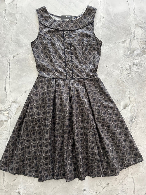 Our Elizabeth cut with all its details is everything you could want and more! Shown in our enchanting Witchcraft print, this cotton dress features piping details throughout the bodice with front non-functional buttons, waist with figure flattering pleats, a vintage inspired twirl-worthy skirt with hidden side pockets, and a back zippered closure.