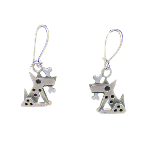 Cast sterling silver dog charm with an enamel painted bone. Completed with locking sterling silver kidney wires. 0.8 x 0.8"each