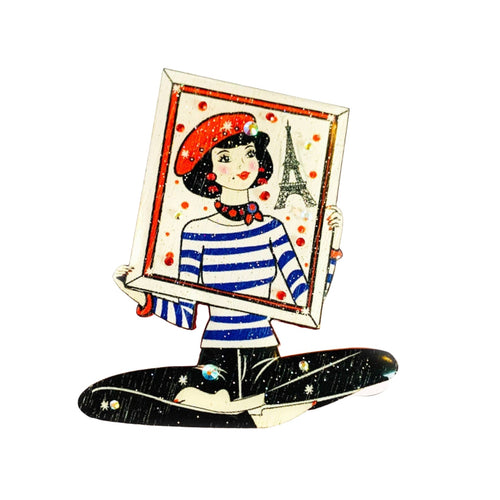 Add some French flair to your outfit with Rosie Parker's French Mime Girl Brooch! This quirky and fun statement piece features a Parisian Juliette dressed as a mime behind a picture frame of Paris. Made with wood, resin, and glitter acrylics, with hand-placed gems for extra sparkle. Perfect for pairing with a striped top and a French beret. J'dore! (Brooch Basics: 7cm x 6cm, double woods and back resin, 24 hour cured resin with glitter glass effect, stainless steel back.)