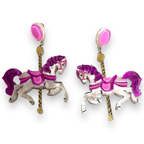 Dress up with quirky charm and vintage flair with Lipstick & Chrome x MAKOKOT's Funfair Carousel Horse Acrylic Earrings! These handmade earrings feature a playful design and unique details. Made with durable and lightweight Acrylic Resin, these earrings measure approximately 3" tall and 2" wide. Add a touch of whimsy to your ensemble with these cheerful statement earrings.