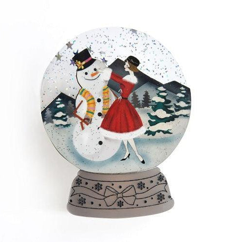 Handmade Materials brass, wood, acrylic Girl with snowman, Snow Globe brooch-Made with acrylic and transferred wood.-Laser cut.-Transparent methacrylate with silver stars and glitter-Silver methacrylate with hand-painted engraving-Silver brass pin-Measures: 5 x 6 cm.Original illustrations and craft by Laliblue NOTE:Laliblue items are pre-order and will be included with our next order from Laliblue - generally approximately 3 weeks. Any questions regarding estimated delivery time, please contact us.