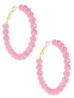 Hoop earring composed of glossy lucite glass beads. This style is finished with a hinge closure. -Hinge Closure -2" Length -2" Diameter -2mm Bead -Nickel and Lead Compliant (Hypoallergenic)
