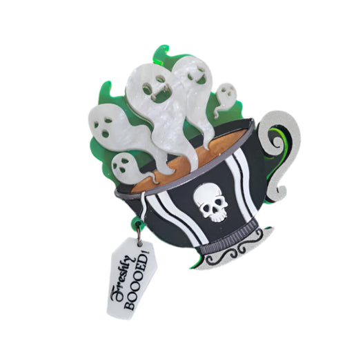 A 'freshly booed' spooky cute design featuring a gothic teacup with little ghosts floating up as steam.