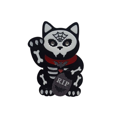 He is constructed from two layers of acrylic with bone sections and piercing swarovski crystal eye socket detail. He measures7 cm and secured to an allergy free brooch backing.