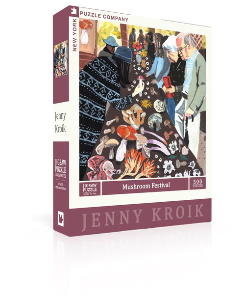 Celebrate the vibrant world of fungi with the Mushroom Festival 500 piece jigsaw puzzle, featuring captivating artwork by Jenny Kroik. This colorful scene captures the charm of a bustling farmer’s market—or perhaps Brooklyn’s famous annual Fungi Fest—where shoppers peruse an array of exotic and beautifully displayed mushrooms. The table overflows with mushrooms in all shapes, sizes, and colors, while purveyors and customers add life to the lively market atmosphere.