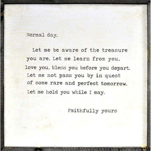 Mary Jean Irion is a poet and essayist known as the Founder and First Director of The Writers Center in New York. The quote reads: "Normal day, Let me be aware of the treasure you are. Let me learn from you, love you, bless you before you depart. Let me not pass you by in quest of some rare and perfect tomorrow. Let me hold you while I may. Faithfully yours." A touching addition for your preferred living space.