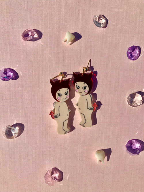 A little devil baby inspired by Sonny Angel dolls. Perfect for Halloween! Made from an original design and laser-cut acrylic. Each piece is handmade, so slight differences can be expected. These are finished with hypoallergenic, anti-tarnish gold-plated earring ball posts.