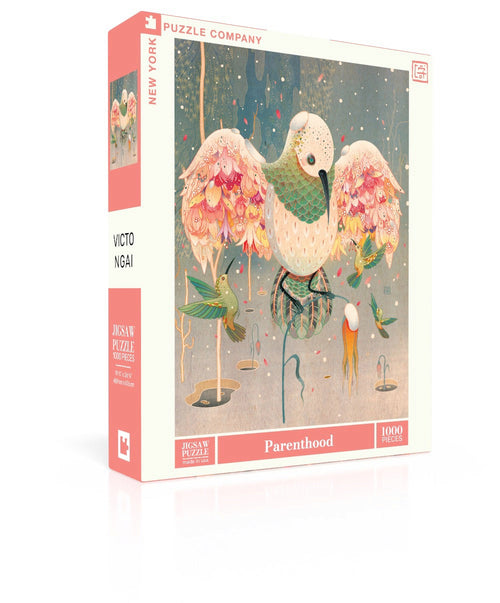 A large maternal hummingbird nurtures her smaller offspring, embodying themes of care and nourishment. Rich in fantasy elements, the artwork of Victo Ngai displays intricate flowers woven into the wings of the birds and a lush forest backdrop, creating a magical and serene scene that celebrates the beauty of nature and the bond between parent and child.