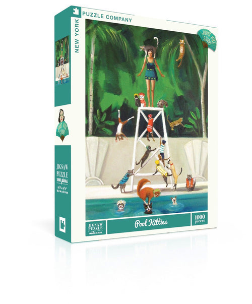 Dive into a scene of feline fun with the Pool Kitties 1000 piece jigsaw puzzle, featuring artwork by Janet Hill. This playful and vibrant illustration showcases a stylish woman in sleek swimwear preparing for a dive, surrounded by a variety of cats—each with their own unique swimwear. Tropical plants and lush greenery create a charming backdrop, completing this sunny and imaginative poolside tableau.