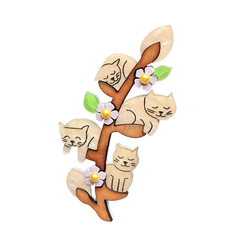 Pussy willows are a sign that spring has arrived and this design aims to bring some fun to your outfit recreating the fuzzy catkins as little happy kittens hanging out on the branches. The brooch is cut from 2 layers of gloss and shimmery marble acrylic and cherry wood with pearl flower detail to add a pop of colour. It measures 10 cm in length and is secured to a scroll brooch bar fastening. This piece will sure add a cheery touch to your outfit this Spring Summer and will no doubt be a talking point when worn in the wild.