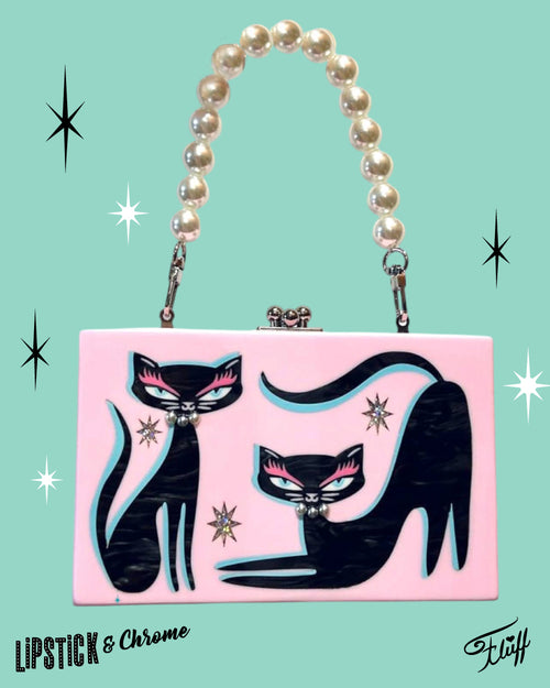 Indulge in retro revival with the Kitty Chic Acrylic Handbag by Miss Fluff x Lipstick & Chrome. Inspired by mid-century lucite handbags, this piece features a vintage style closure and will add a mid-century flair to any outfit. Fully made from acrylic, featuring an inlaid atomic cat design by Miss Fluff, it includes 3 handle options: A crossbody or should length chain, a pearl beaded handle, or tuck away the clips and use it as a clutch.