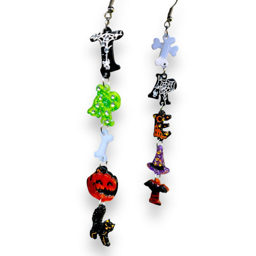 Get into the spooky spirit with our mismatched Trick or Treat Earrings by Lipstick & Chrome! These playful earrings feature acrylic resin construction with handpainted details and crystal accents, while also being extremely lightweight and easy to wear. Don't forget to complete the look with the matching brooch!