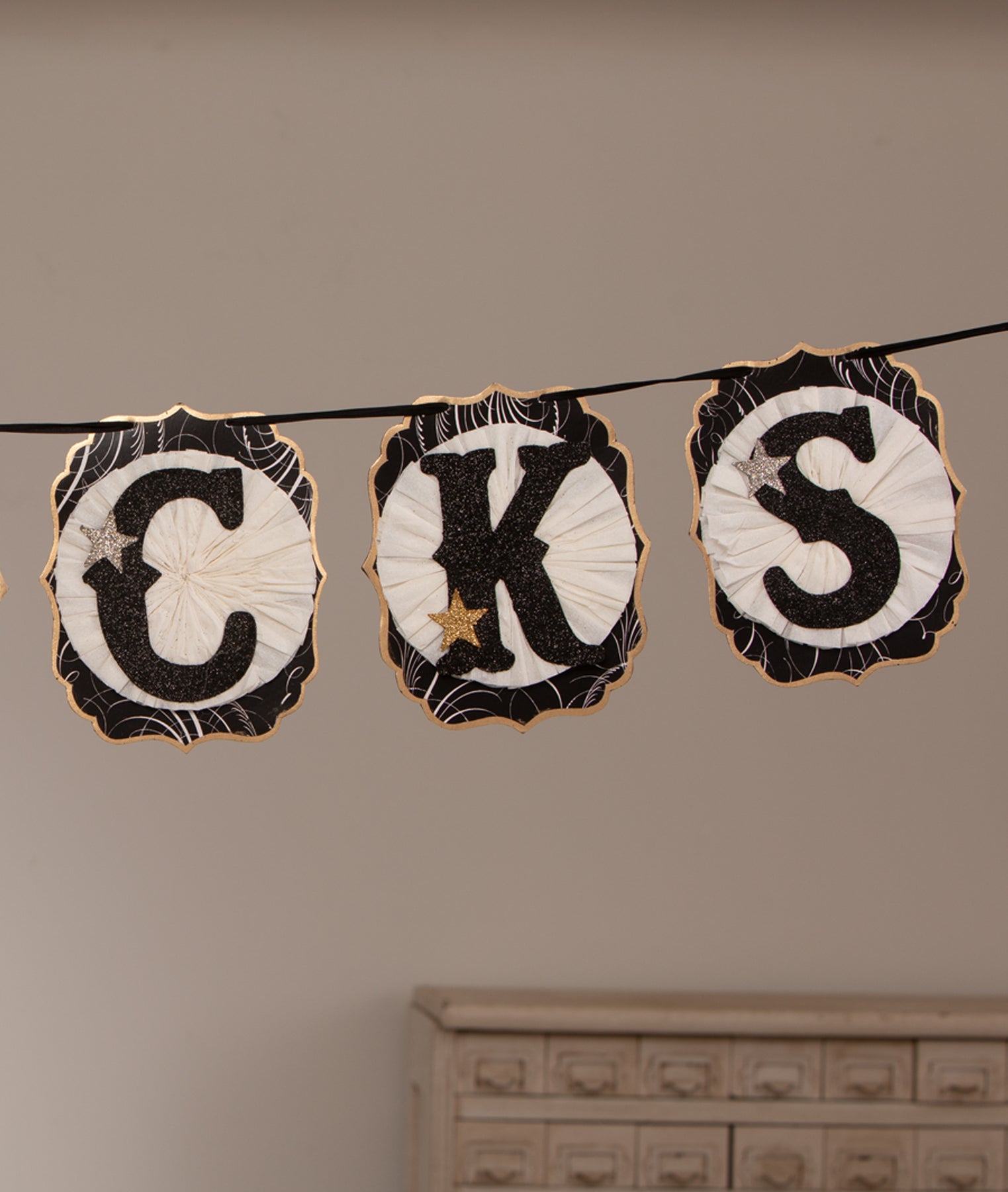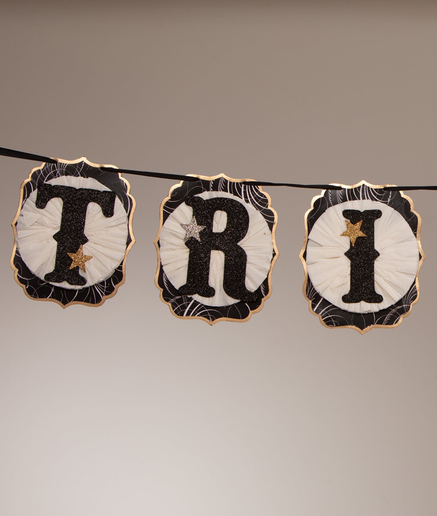Add a finishing touch to your Halloween decor with the Tricks Star Garland by Dee Foust-Harvey. This layered garland spells out “TRICKS” with printed paper pennants, crepe paper rosettes, and glittered letters accented with sparkling stars. Perfect for mantels, doorways, or party decor, this charming garland brings vintage-inspired whimsy and playful Halloween flair to any space.