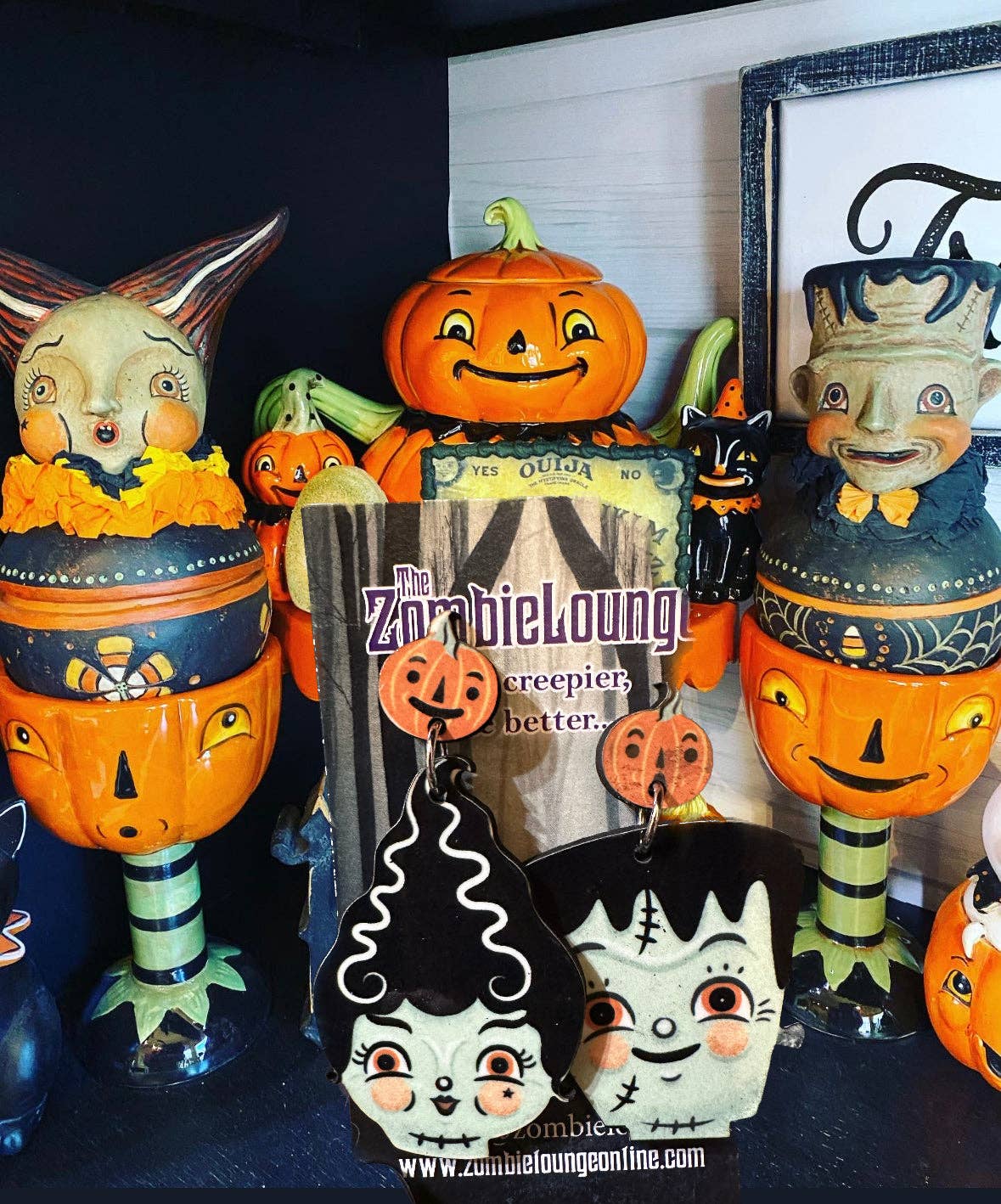 Celebrate eerie elegance with the Frankie and Bride Earrings, crafted by Johanna Parker Design JPD Partners in Crafts. These hanging earrings capture the spooky charm of Frankenstein’s monster and his mysterious bride, perfect for adding a touch of gothic romance to any outfit. Lightweight and detailed, they bring a hauntingly playful vibe that’s ideal for fans of classic monster tales.