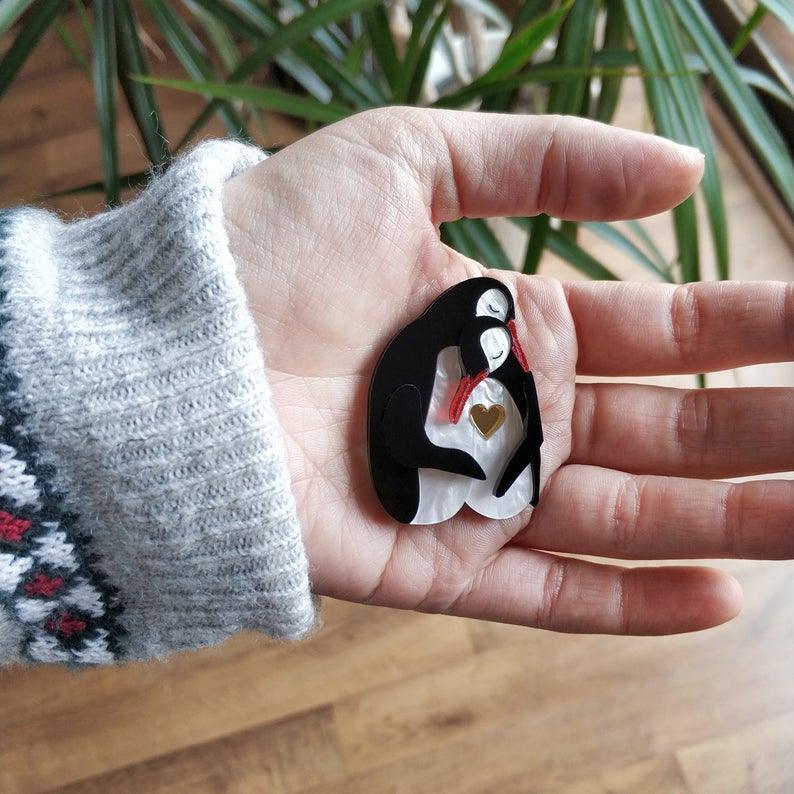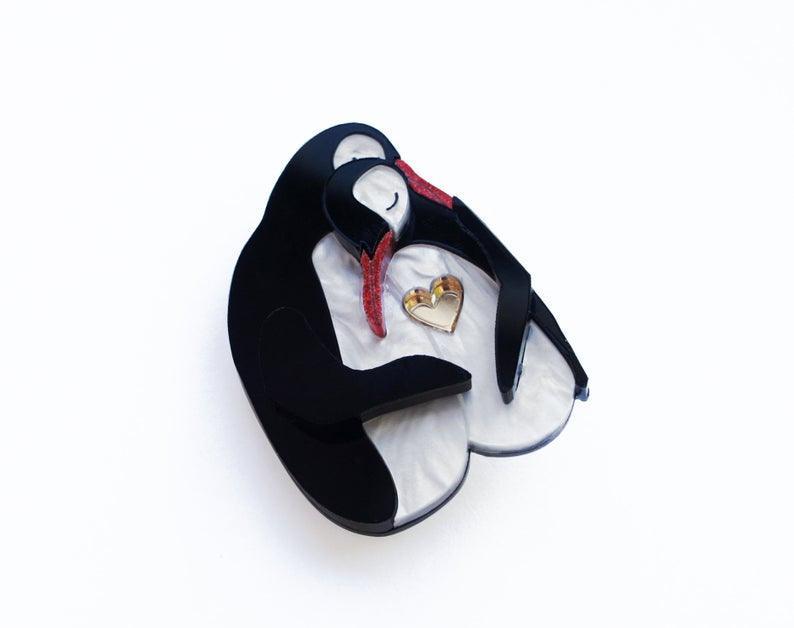 Materials brass, methacrylate Penguin Couple.Sphen and Magic, Two male penguins from a Sydney aquarium formed a nest, hatched an abandoned egg by a hetero couple and proved to be the best parents of the entire colony: their offspring was one of the few that was born and their relationship became a big symbol for the country.Characteristics:-Size: 3,5 x 4 cm-Pearly, mirror, and glitter methacrylate.-Colour: black, white, red and gold-Brooch of brass   NOTE:Laliblue items are pre-order and will be included with our next order from Laliblue - generally approximately 3 weeks. Any questions regarding estimated delivery time, please contact us.