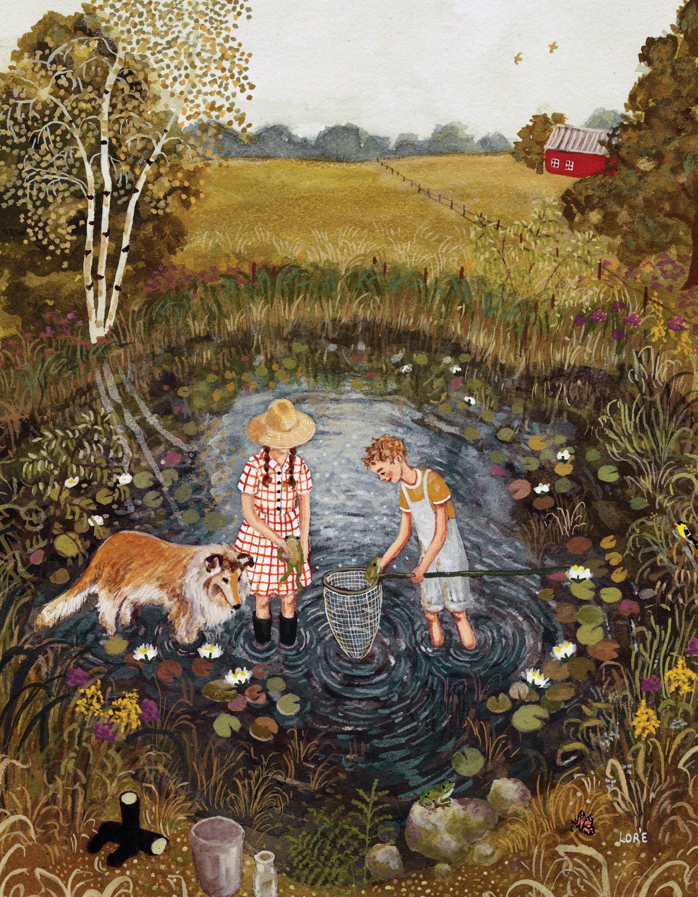 Immerse yourself in the charm of a warm summer day with the "Dog Days" Mini Puzzle, illustrated by renowned artist Loré Pemberton. This delightful puzzle captures the essence of childhood and nature, depicting a young boy and girl catching frogs in a serene pond, surrounded by lily pads and lush swampy greenery. Their loyal collie stands watch nearby, adding a sense of companionship to the tranquil scene. In the distance, expansive fields stretch toward a vibrant red barn, completing this idyllic country setting.