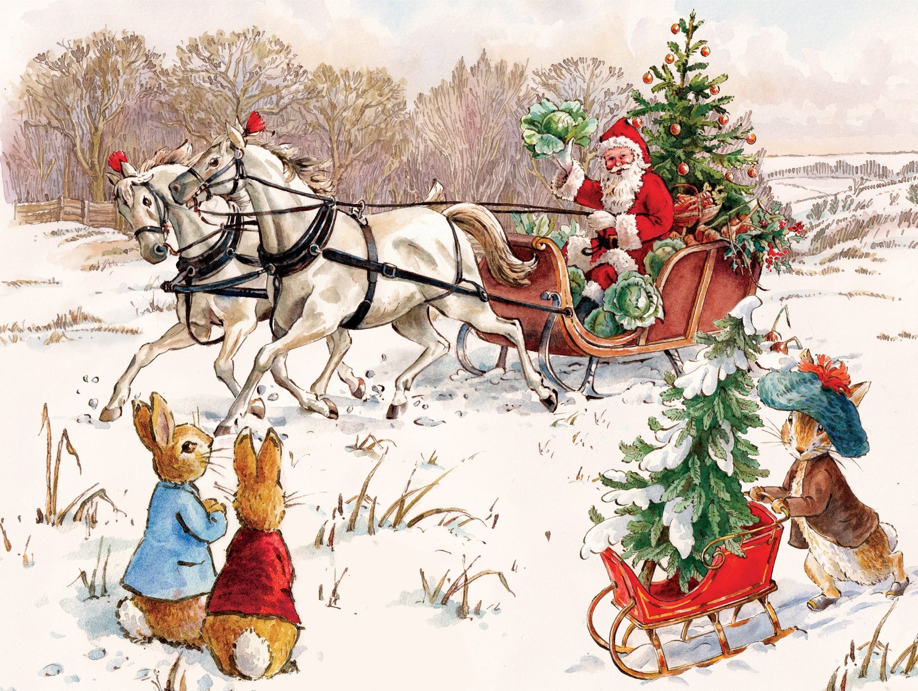 Celebrate the holiday season with a charming twist on a beloved classic in Peter Rabbit and Santa, a 1000 piece jigsaw puzzle inspired by Beatrix Potter's enchanting world. In this delightful winter scene, Santa Claus rides in a horse-drawn sleigh through a snow-covered field, bringing festive cheer—and a basket of cabbages—as gifts for Peter Rabbit and his woodland friends. As the friends prepare to take their Christmas tree home, the magical moment unfolds, blending holiday spirit with the timeless charm of Potter's beloved characters. Perfect for families, fans of Beatrix Potter, and puzzle enthusiasts, this heartwarming puzzle captures the joy of the season and the coziness of woodland friendship. Piece together this whimsical holiday adventure, and enjoy a festive journey with Peter Rabbit and Santa, one snowy detail at a time!