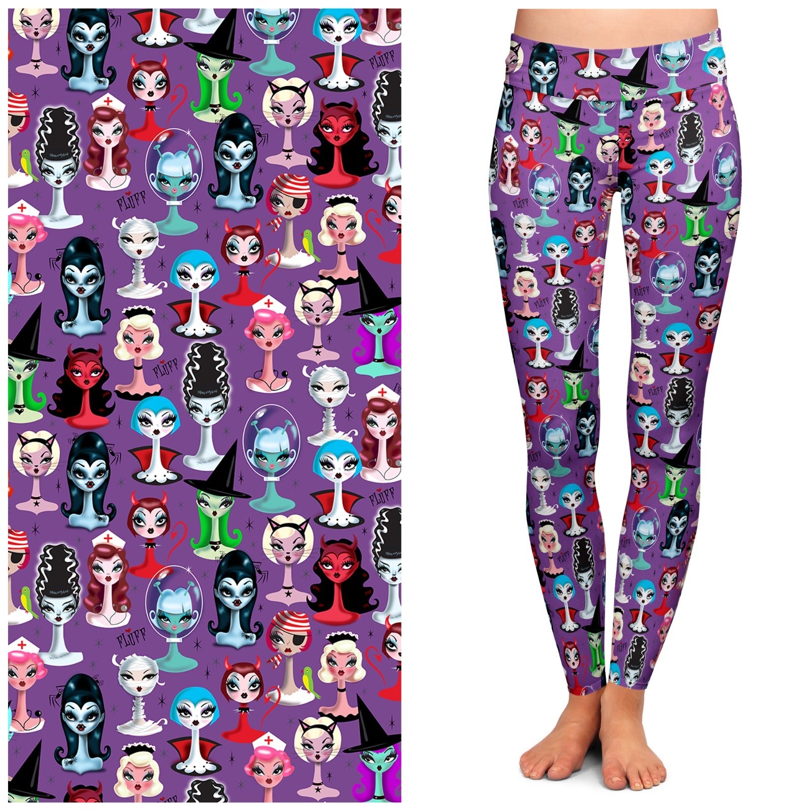 "Spooky Dolls" High-Quality, Buttery Soft Leggings feature a charming Halloween doll pattern designed by Miss Fluff.