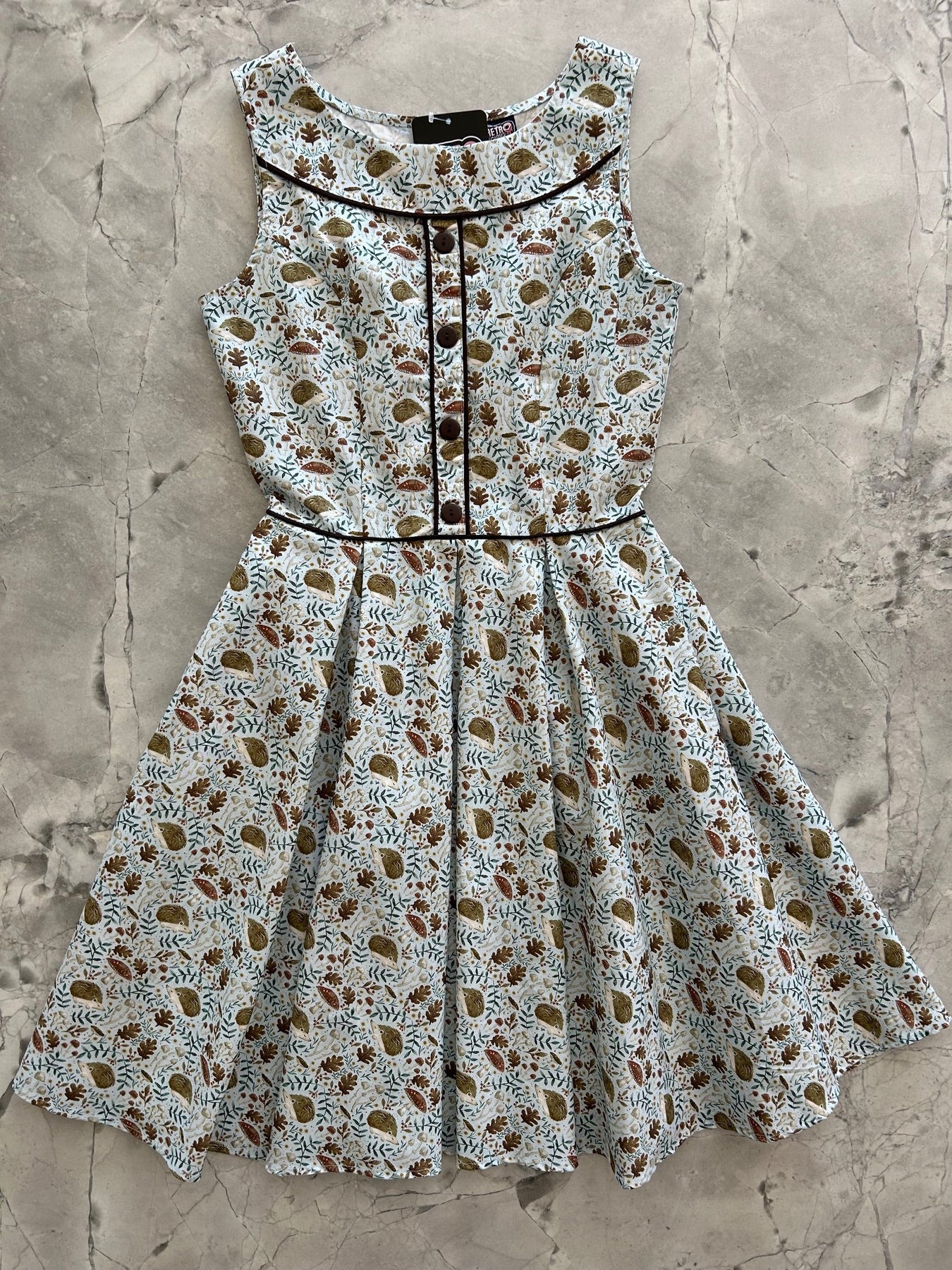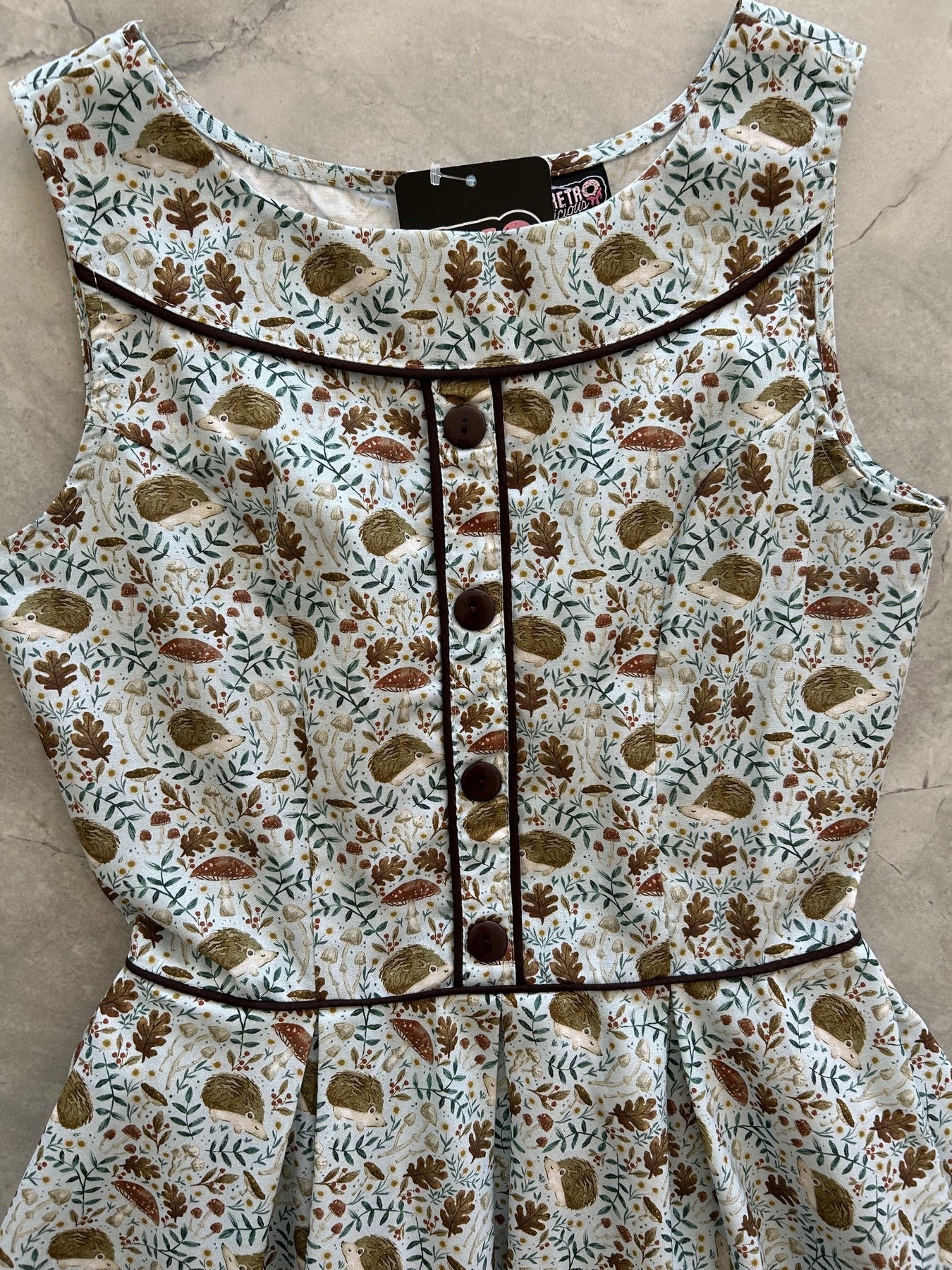 Looking for a classic vintage style dress?  Our Elizabeth cut with all its details is everything you could want and more!  Shown in our Hedgehogs print, this cotton dress features piping details throughout the bodice with front non-functional buttons, waist with figure flattering pleats, a vintage inspired twirl-worthy skirt with hidden side pockets, and a back zippered closure.