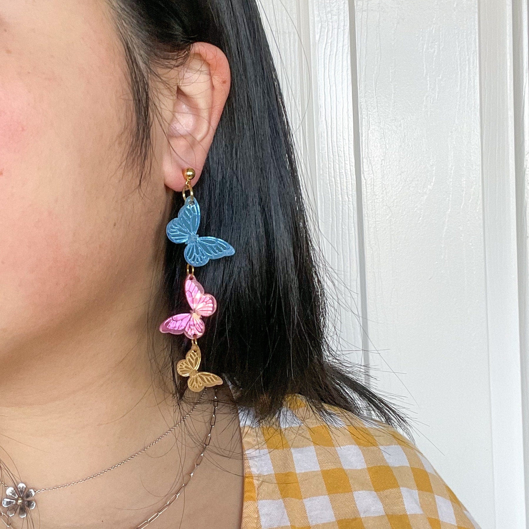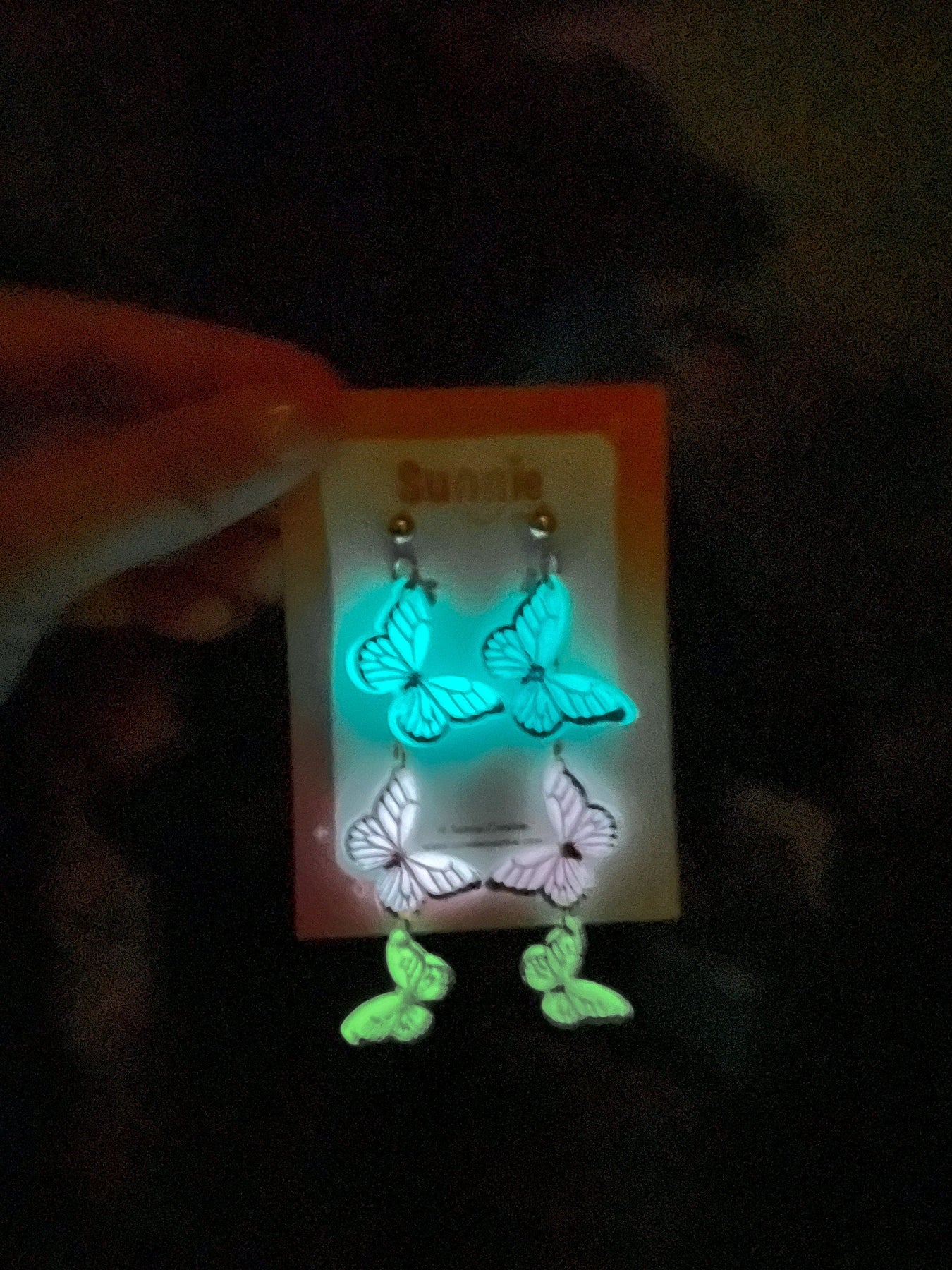 Kaleidoscope Butterfly earrings offer a unique statement to any look. Light up the night with beautiful glow in the dark colors, or opt for a great reflection in the day. Make a bold, colorful statement with these eye-catching earrings.