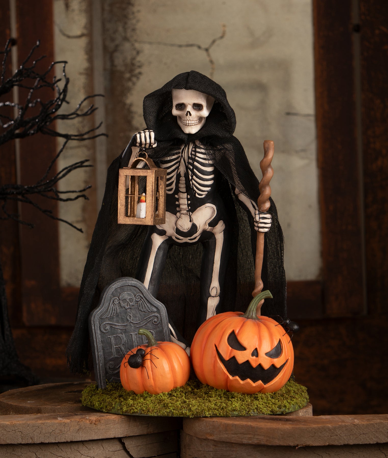 Step into spooky elegance with Graveyard Gideon Skeleton! This intricately detailed skeleton stands guard next to a tombstone, flanked by two pumpkins (one with a mischievous spooky face) complete with little crawling spiders. He holds a spooky lantern in one hand and a twisted staff in the other, draped in a flowing black gauze hooded cape. A vintage-inspired Halloween collectible full of personality and charm, Graveyard Gideon is perfect for adding a touch of eerie sophistication to your seasonal decor.