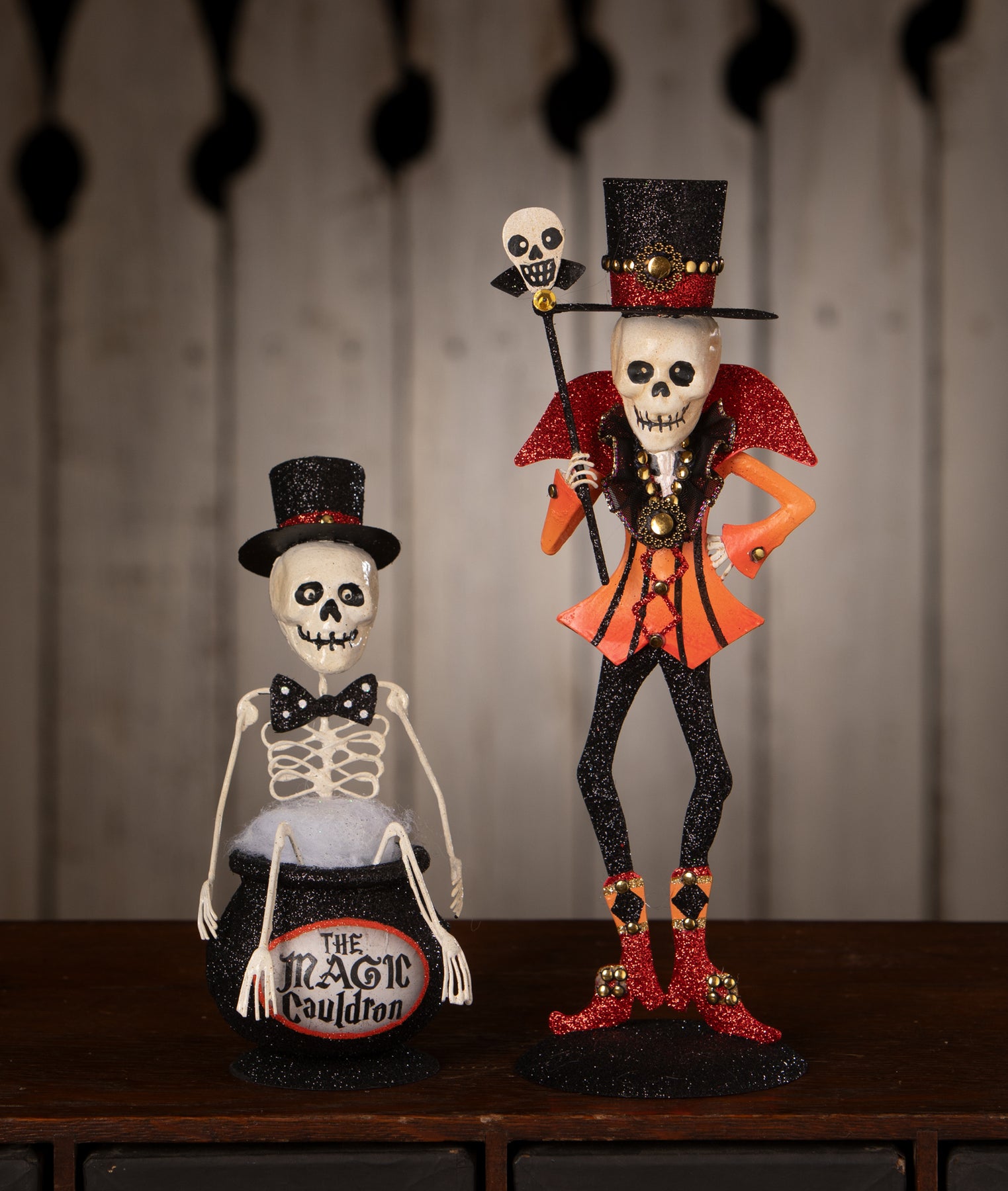 Designed by Bethany Lowe for Bethany Lowe Designs, this collectible halloween accent is crafted from hand-painted tin, glitter, paper, batting, and wire and brings vintage-inspired charm to mantels, shelves, tabletops, entryways, and seasonal displays.