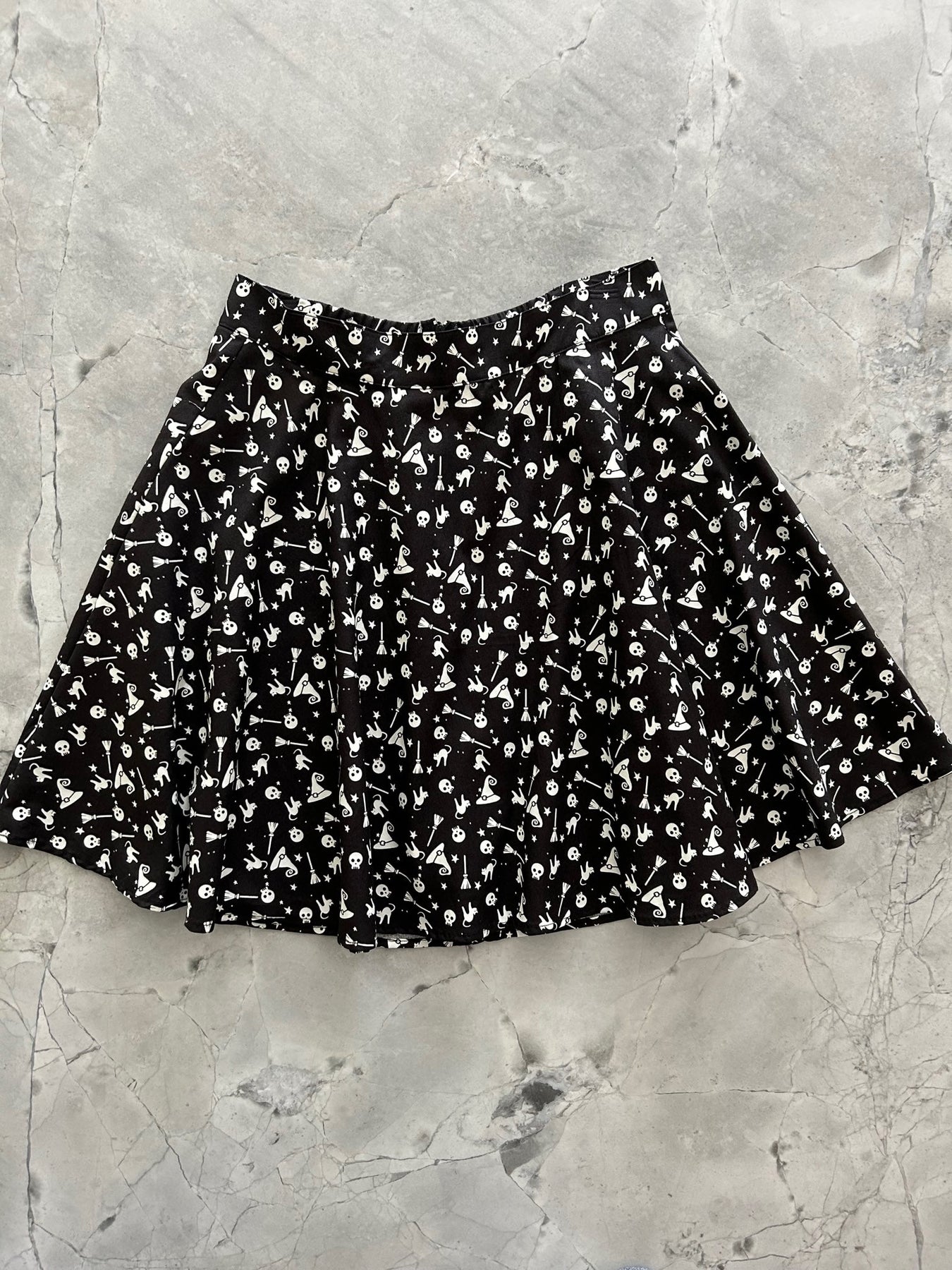 Introducing the Hocus Pocus Glow in the Dark Skater Skirt, a bewitchingly delightful style that brings a touch of magic and whimsy to your wardrobe. This skirt is perfect for those who love to enchant and captivate with their style. The Hocus Pocus Skater Skirt is versatile, allowing you to style it for various occasions. Whether you're attending a themed party, a night out with friends, or simply want to add a touch of magic to your everyday outfits, this skirt is sure to be the center of attention.