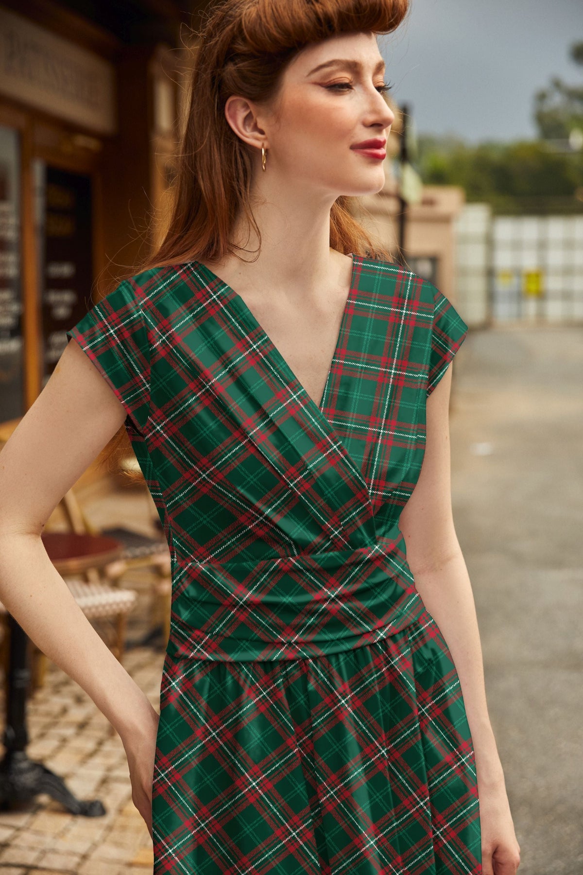 The Greta is everything you could want and more!  Shown in our Holiday Plaid print, this vintage style cotton dress features a gathered surplice neckline, cummerbund waist with figure flattering gathers, a vintage inspired twirl-worthy skirt with hidden side pockets, and a back zippered closure.