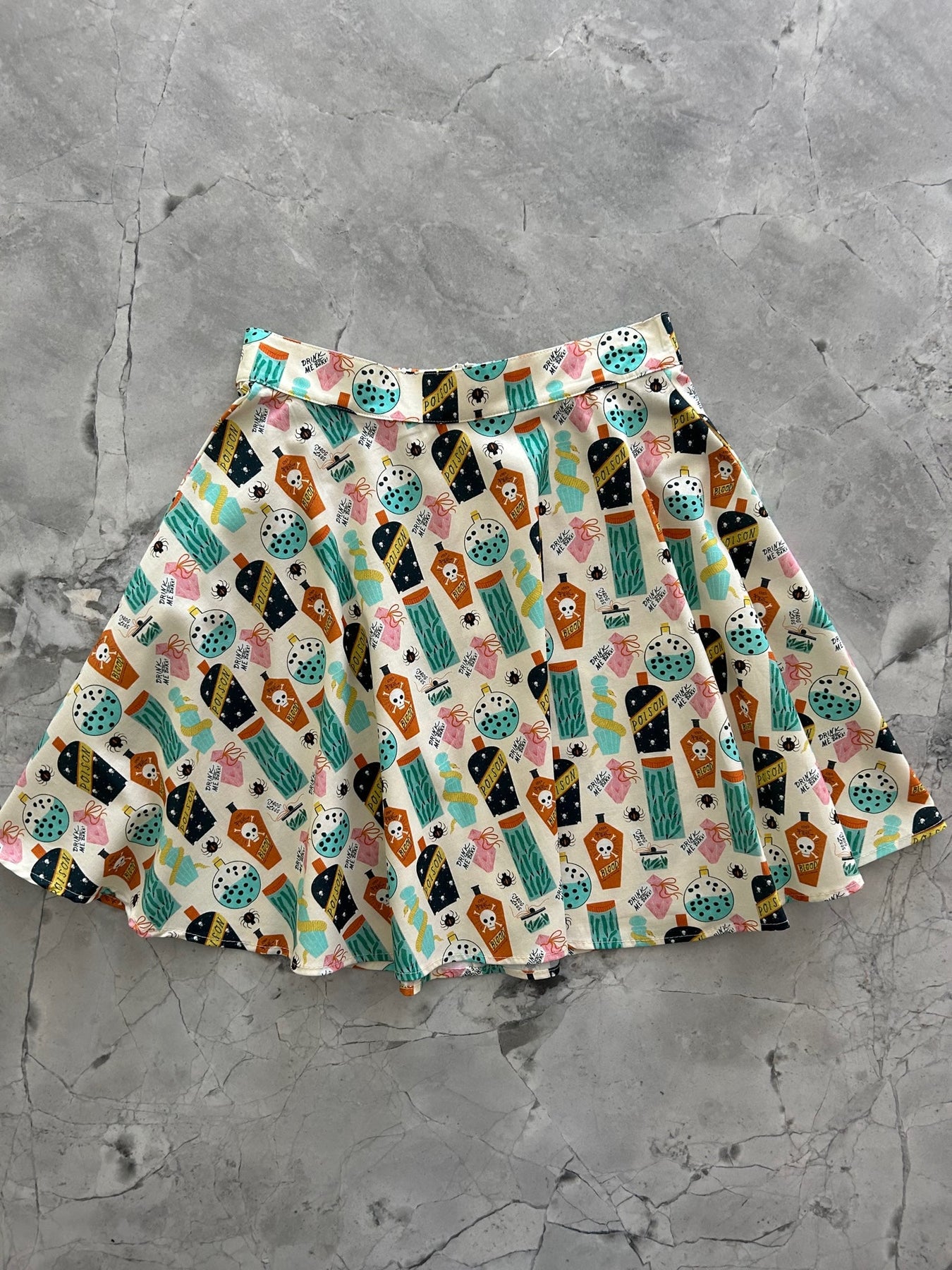 Introducing the enchanting Potion Skater Skirt, a bewitching fashion piece that captures the essence of a mystical laboratory. With its captivating print featuring bottles of poison, blood, and frog legs, this skirt invites you to delve into the world of potions and spells with a touch of dark allure.