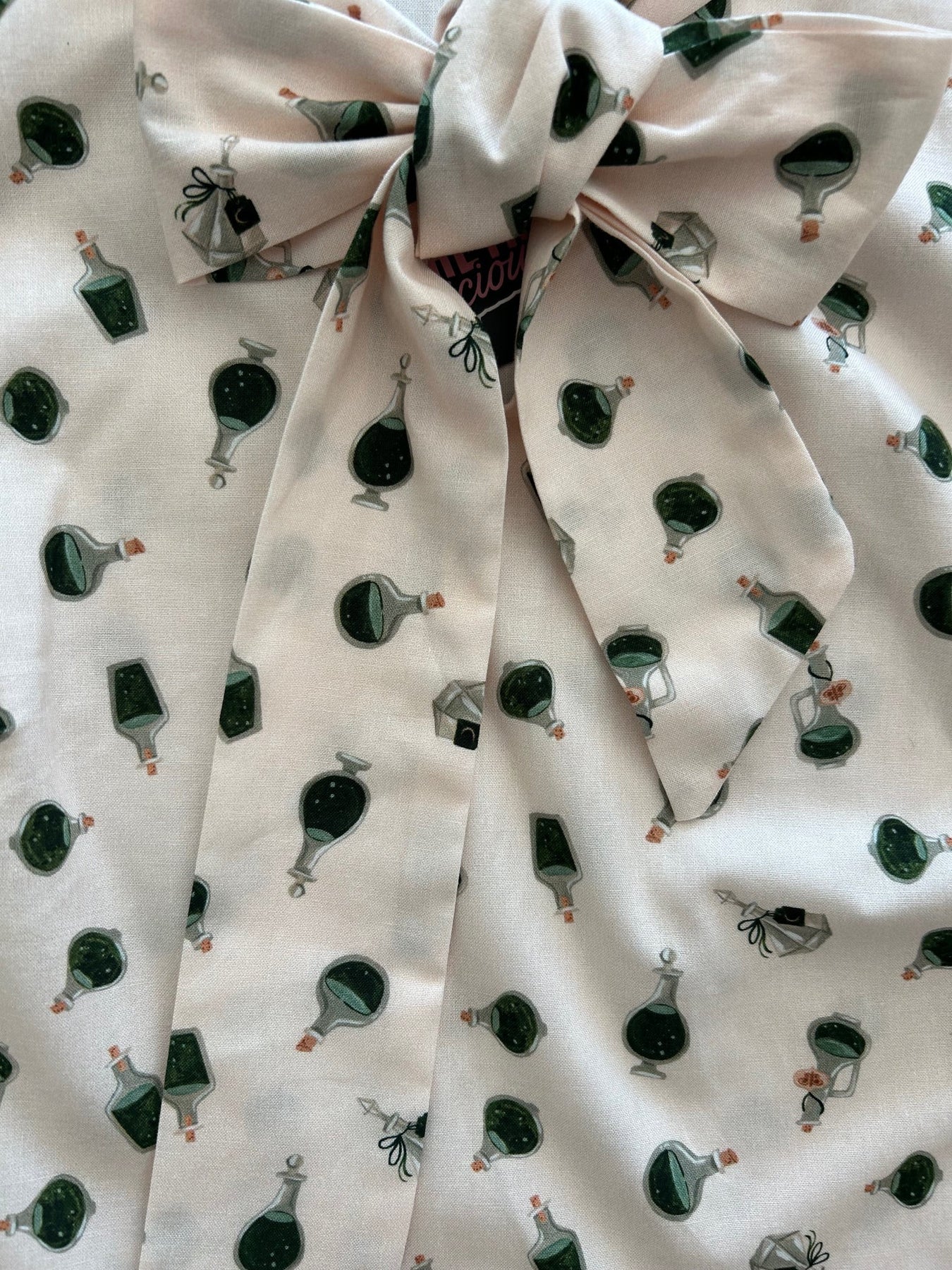 This top is for the vintage lover at heart! Now available in our Potions print. This 100% cotton top features bust darts for a flattering silhouette, a side zippered closure for ease of wear, and an oversized bow at the neckline for that perfect 1950's inspired look.