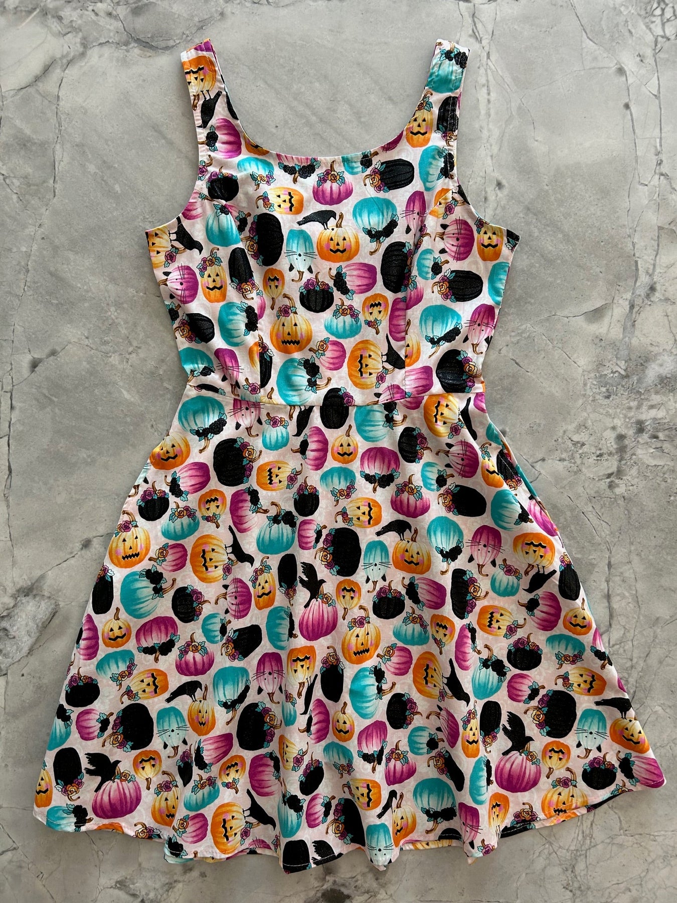Fun, flirty, and totally retro: our skater dress is the perfect addition to your closet! Shown in our Pumpkin & Crow print, this vintage inspired dress features a scoop front and back, elasticized waist in the back for ease of wear, a flirty a-line skirt with hidden side pockets, and a back zippered closure.