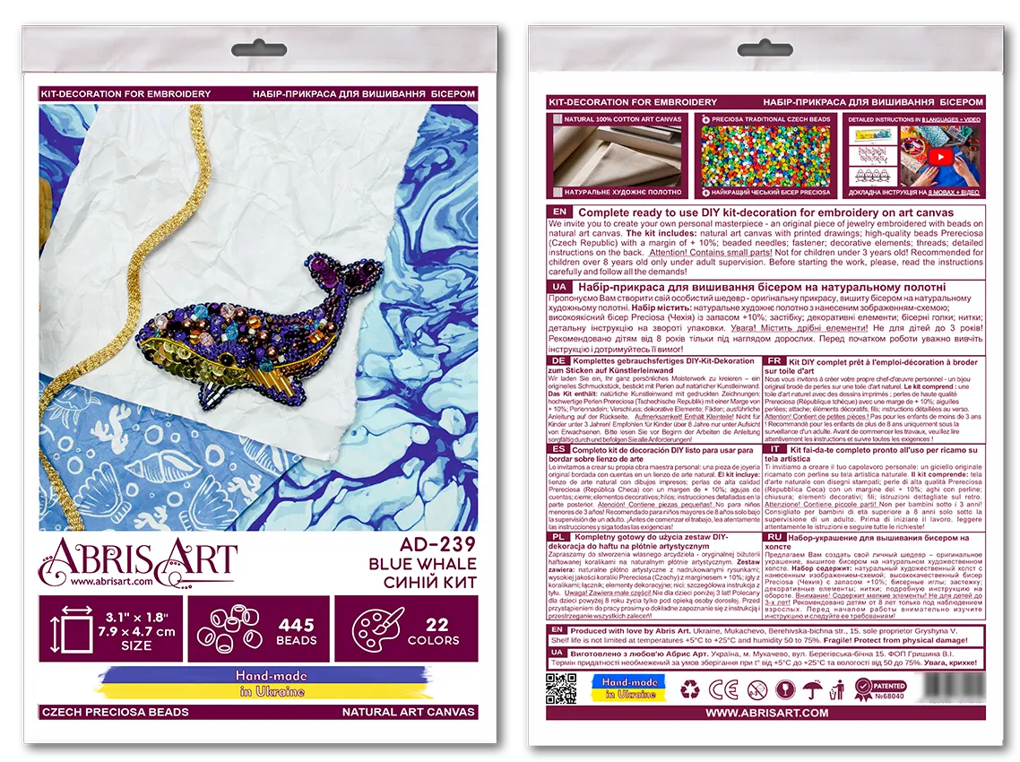 It is additionally equipped with beads (PRECIOSA No. 6 - beads) 2 types (10 pcs.), microbeads (PRECIOSA No. 13) - 4 colors, a needle for embroidery with microbeads, decorative stones in the shape of a rondel - 5 types (13 pcs.). glass beads - 3 types (19 pcs.), pearls (6 pcs.), sequins - 2 types (41 pcs.) and canitel (8 cm), accessories for making brooch jewelry - a decorative clasp, and detailed step-by-step illustrated instructions for embroidery and subsequent design of the embroidered decorations. (Beads 22 colours). Dimensions 7,9*4,7cm / 3,11*1,85in. Made in Ukraine.