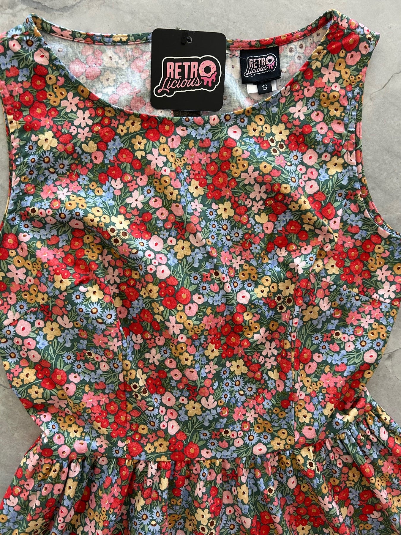 A vintage style piece with fun, modern details in our Painted Floral print.  Made from 100% cotton, this classic 1950's inspired dress features a high neckline, longer length skirt with hidden side pockets and back zippered closure.