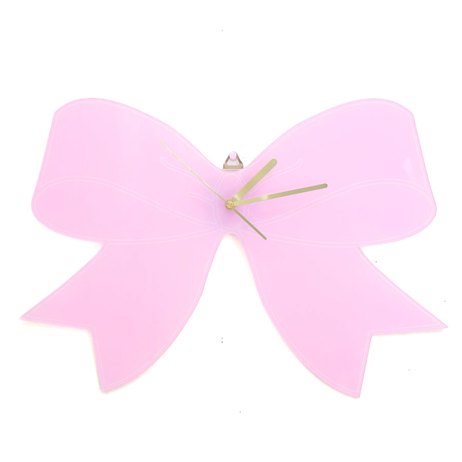 18" acrylic pink bow clock. Requires 1 AA battery (not included).