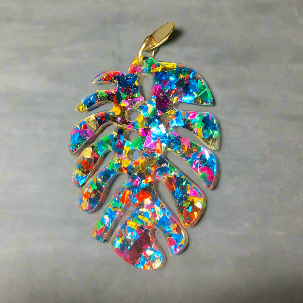 Handmade acrylic Monstera leaf earrings in a beautiful multicolor pattern. These earrings are party perfect!