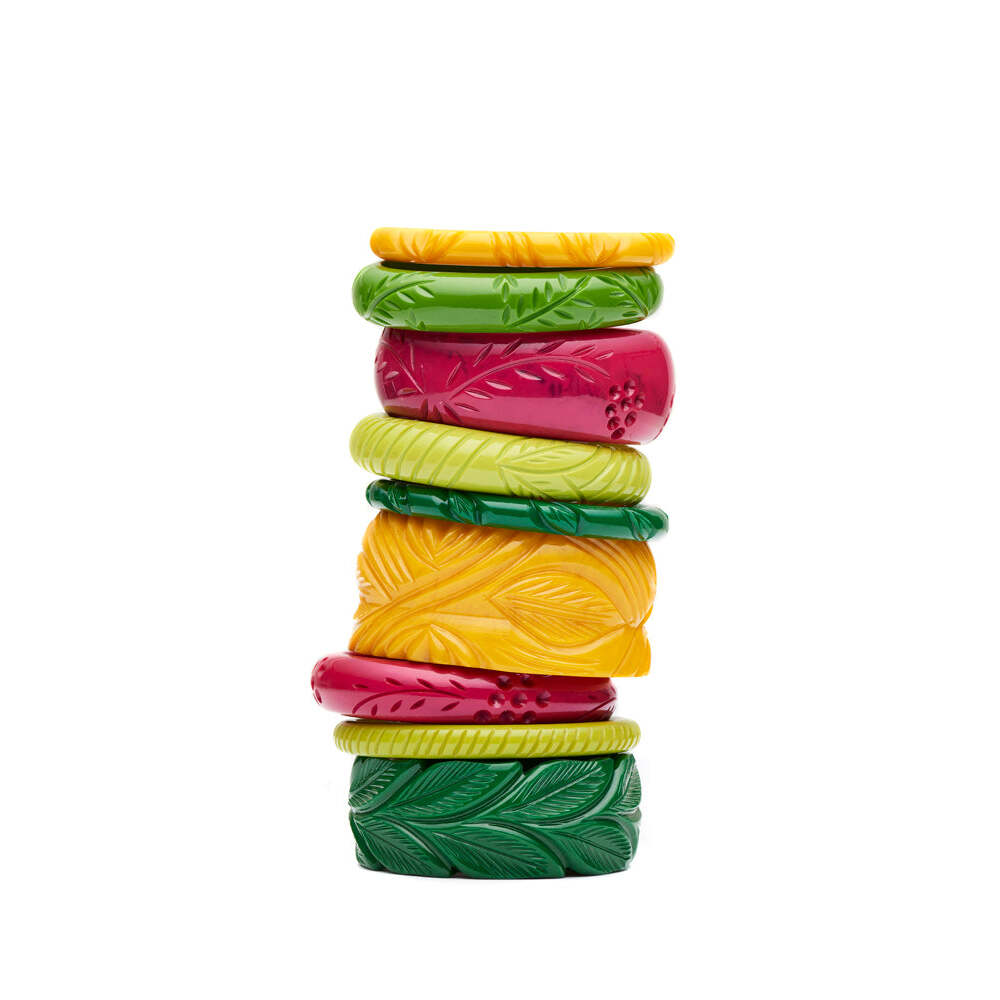 A bright and beautiful green, the Narrow Chartreuse Fakelite Bangle is a really eye catching number! Straight from the tropics, Chartreuse looks incredible stacked with other green jewellery or amp up the neon vibes with some pinks and oranges.