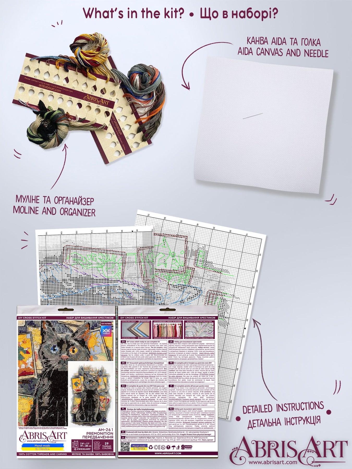 The set is completed with canvas 290*380 mm white color count 14, threads 85m.