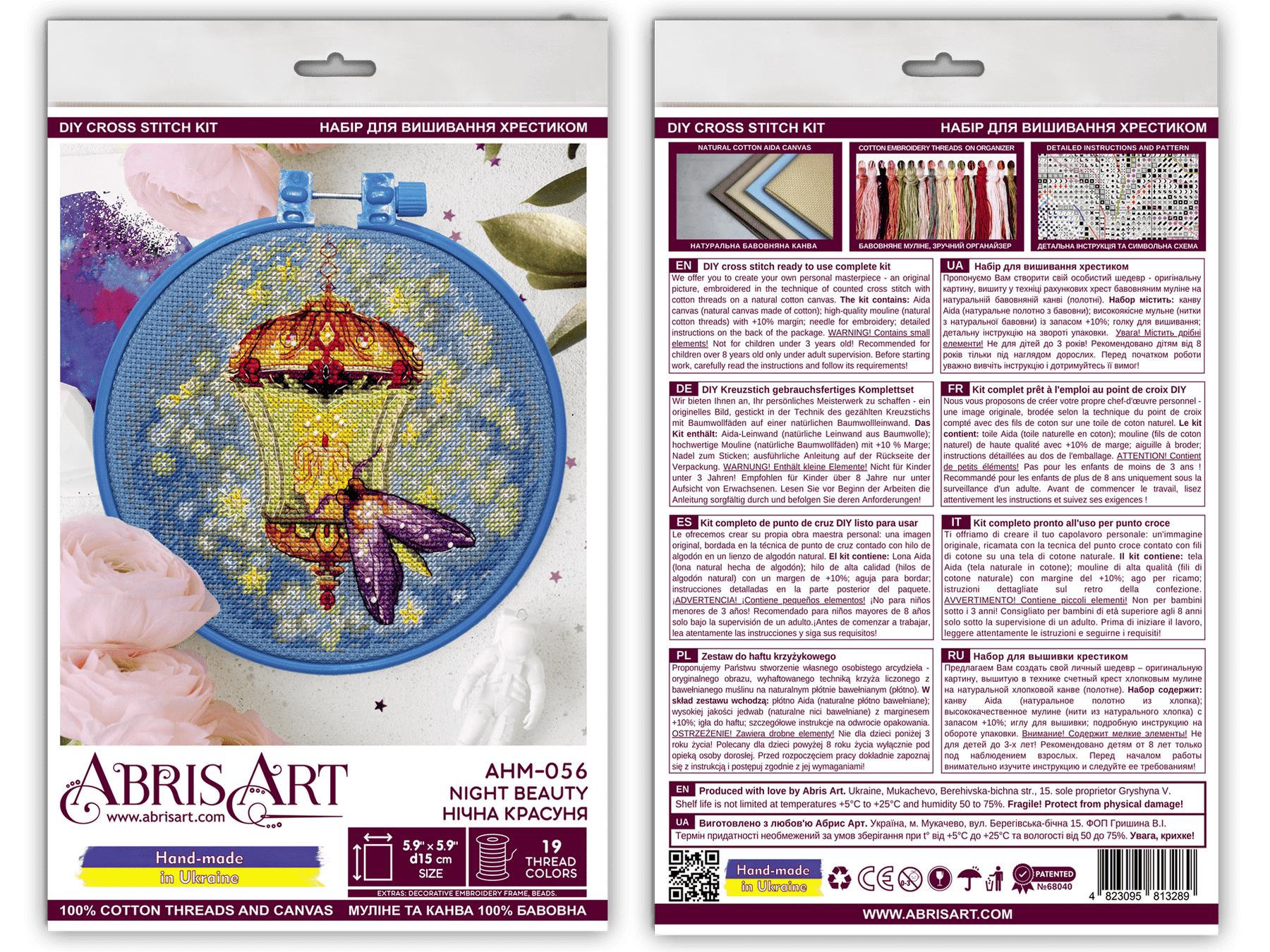 Kit contains: Canvas 100% cotton (blue 14 count), convenient symbol scheme + instruction in 8 languages, needles and a bead embroidery needle, beads PRECIOSA, floss on a convenient organizer - 100% cotton (19 colours). Dimensions 15*15cm / 5,91*5,91in. Made in Ukraine.