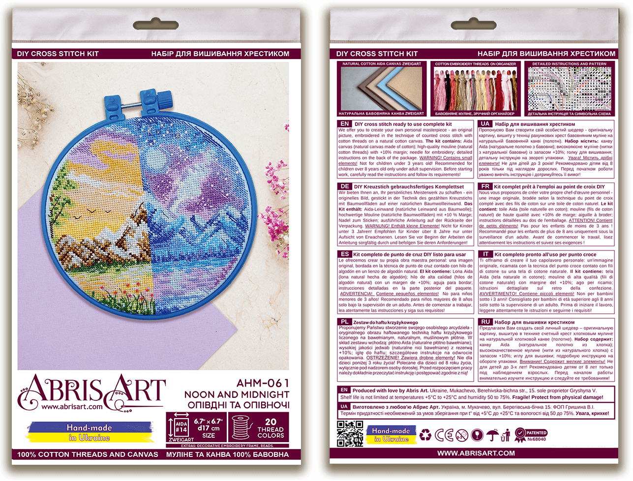 Kit contains: Canvas 100% cotton (14 count), beads, convenient symbol scheme + instruction in 8 languages, needles, floss on a convenient organizer - 100% cotton (17 colours), Dimensions 17*17cm / 6,69*6,69in. Made in Ukraine. Embroidery hoop is included.
