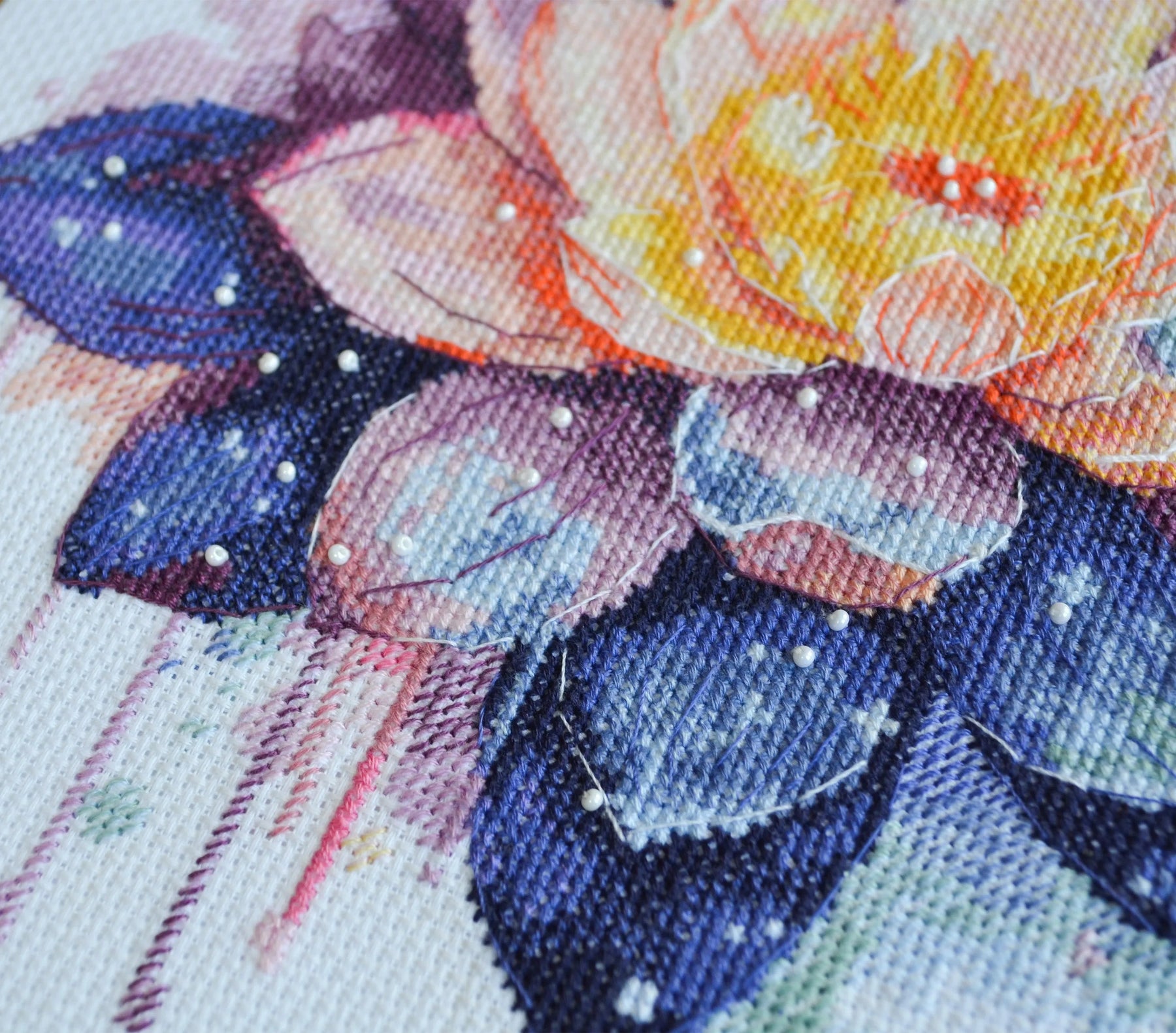 In each carefully assembled box Cross-stitch kits Shining lotus (Deco Scenes) after purchase and delivery you will find: a large piece of canvas (embroidery fabric) larger than the size of the picture - 240 x 240 mm. - with enough margin to comfortably embroider and decorate the finished picture! As well as a special needle for cross-stitching and all the necessary threads (floss) - 20 colors on a convenient organizer, of course - with a margin, because you can embroider with a cross in different ways. And most importantly - detailed instructions, a cross-stitch pattern, specially designed by our designers for each set separately!