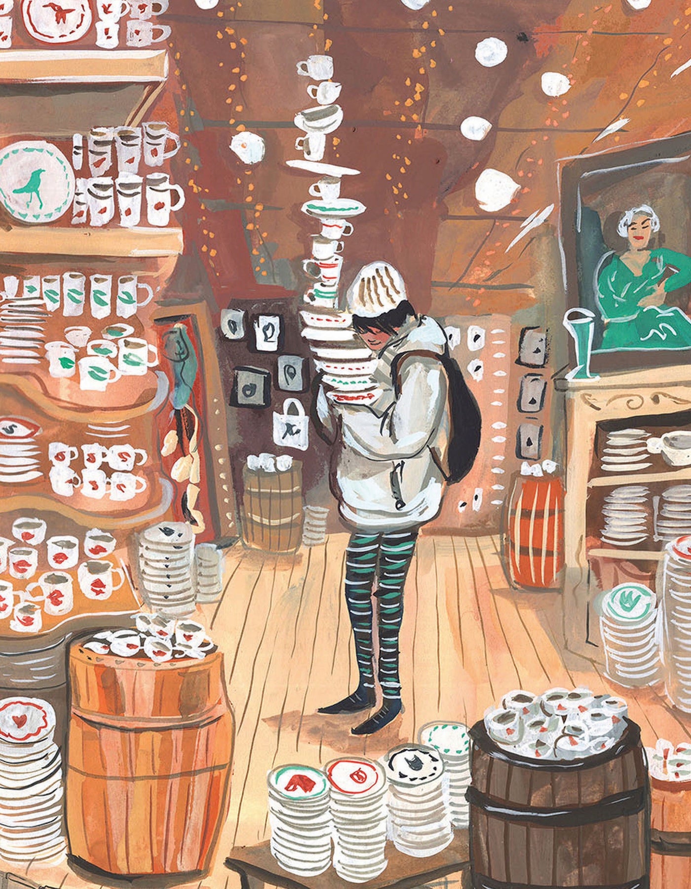Step into a bustling world of patterns and porcelain with the Dish Store 100 Piece Mini Puzzle. This charming puzzle, illustrated with bright and intricate detail, features a woman balancing an impressively tall stack of dishes as she navigates a vibrant dish shop. Surrounded by shelves filled with plates, bowls, and cups in an array of repeating patterns, this puzzle offers a playful yet challenging experience.