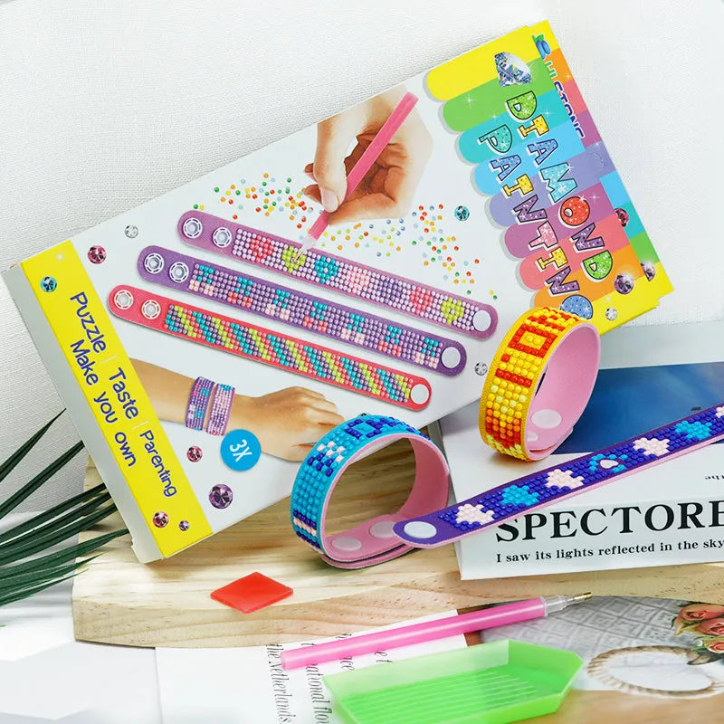 Perfect for kids and adults alike, this kit includes three adjustable bracelets and vibrant diamond beads. Use the provided tools to design and decorate your bracelets with dazzling patterns. Unleash your creativity and enjoy a fun, engaging crafting experience! Follow the simple steps to apply the diamond beads to the bracelets, creating intricate designs that sparkle and shine. This kit is perfect for a fun, creative activity at home or as a gift for craft enthusiasts.