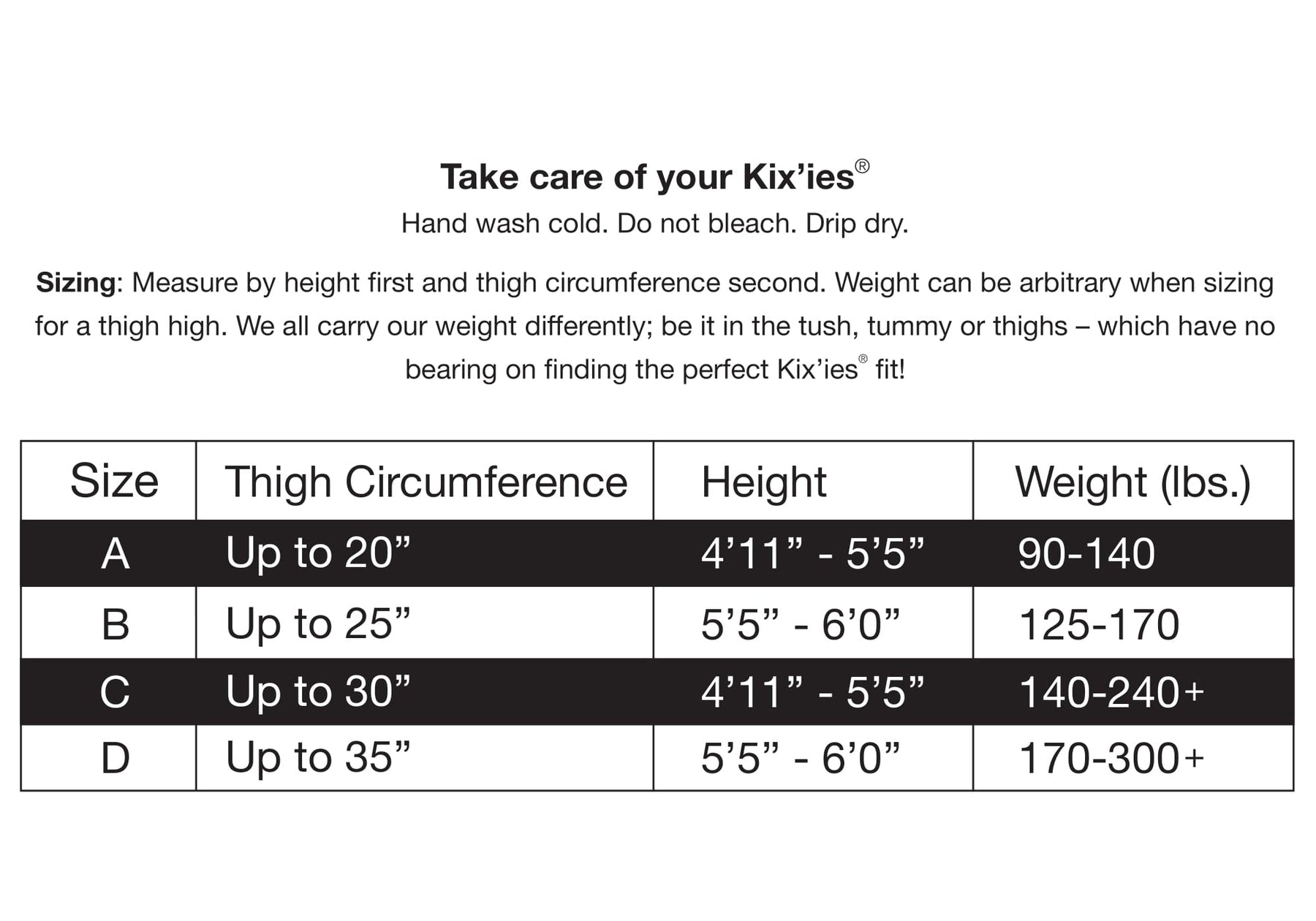 Sizing: Measure by height first and thigh circumference second. Weight can be arbitrary when sizing for a thigh-high. We all carry our weight differently; be it in the tush, tummy or thighs – which have no bearing on finding the perfect Kix’ies® fit! Time to kick those binding tights and outdated hosiery to the curb!